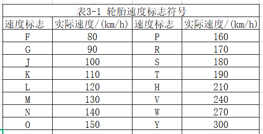 輪胎標(biāo)識還包含負(fù)荷能力和速度級別。傳統(tǒng)表示負(fù)荷能力的方法是用棉簾線的層數(shù),也就是通常所說的層級表示,隨著新型簾線不斷應(yīng)用,這種表示法被負(fù)荷指數(shù)取代。國際標(biāo)準(zhǔn)將輪胎全部能預(yù)計(jì)到的負(fù)荷量從小到大依次劃分為280個(gè)等級負(fù)荷指數(shù),每個(gè)指數(shù)數(shù)字代表一 級負(fù)荷能力,其差級約為3%。國際標(biāo)準(zhǔn)化組織(ISO)還對輪胎速度等級有詳盡規(guī)定,具體內(nèi)容如表3-1所示。