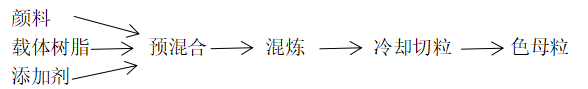色母粒的生產(chǎn)方法有多種,但基本工藝均可用以下過(guò)程簡(jiǎn)示: