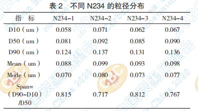 D10、D50、D90分別是分布曲線中累積分布為 10%、50%、90%時(shí)的最大顆粒的等效直徑,Mean是分布曲線中粒徑的平均值,Mode 是分布曲線中 粒徑的眾數(shù),代表占比例最多的粒徑大小。Span代 表樣品的粒徑分布寬度。由表2可以看出,N234-1 的粒徑較小,但是粒徑分布較寬,N234-2 的粒徑 較大,粒徑分布較窄,3# 樣和 4# 樣介于中間。