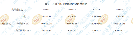 由圖 3 和表 6 可以看出,炭黑的結(jié)構(gòu)度越高, 在橡膠中的分散性越好,因?yàn)樘亢诘慕Y(jié)構(gòu)度越高, 表明炭黑越松散,雖然混煉過(guò)程中需要更多的混 煉時(shí)間,但是炭黑分散性能越好,所以 N234-1 和 N234-3的分散度較好,而N234-2因?yàn)樘盍现g的 相互作用力較弱,易混煉,因此分散性也較好。