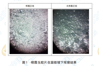 選擇一塊表面已出現(xiàn)部分噴霜現(xiàn)象的膠片, 放在普通光學(xué)顯微鏡下觀察。見(jiàn)圖 1。
