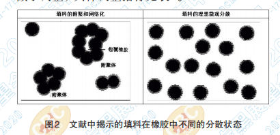 按照這一邏輯,如果必須從炭黑的質(zhì)量方面 改善,那么改善炭黑在膠料中的分散性能將改善 膠料的泛彩現(xiàn)象。炭黑在膠料中分散性若不好,則必然存在著微觀分散不良的現(xiàn)象,即在橡膠中 部分炭黑仍以附聚體的形式存在,見(jiàn)圖2。形成的 附聚體將比膠片的其它部位更容易吸附操作油等 液體物質(zhì),在混煉中這部分膠料若分布在成品的 表面,就很可能發(fā)生泛彩現(xiàn)象。