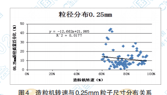 通過線性回歸發(fā)現(xiàn):造粒機(jī)轉(zhuǎn)速與 0.25mm 粒 徑分布負(fù)相關(guān),隨著造粒機(jī)轉(zhuǎn)速的增加,粒子分布 在 0.25mm 的炭黑質(zhì)量百分含量隨之下降。