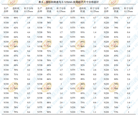 通過上面六個(gè)表和六個(gè)圖的關(guān)系對比,可以 看出,在對造粒機(jī)轉(zhuǎn)速調(diào)整時(shí),對炭黑粒子尺寸分 布有直接關(guān)系。