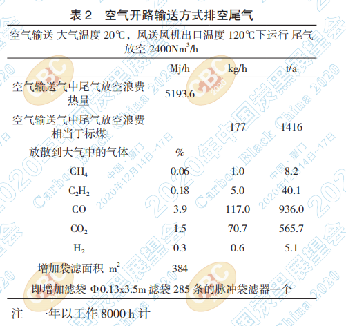 由于空氣開路輸送方式的尾氣需要放空,因 此當(dāng)炭黑尾氣泄露到輸送氣里的量占輸送氣量 30%狀況下運行時,這種條件下浪費的尾氣各詳細(xì) 數(shù)據(jù)見下表 2。