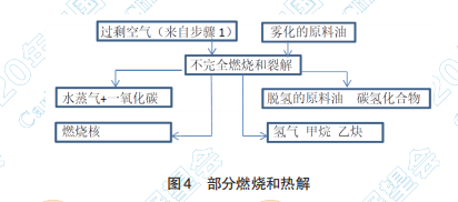 圖4步驟3幾乎是在原料油在高溫燃余氣霧化 以后同時(shí)產(chǎn)生的。在步驟3中,兩個(gè)關(guān)鍵步驟同時(shí) 發(fā)生。其中一個(gè)是燃料完全燃燒以后由于過(guò)剩氧 的存在,原料油的不完全燃燒。此燃燒向過(guò)程中 提供了額外的熱量,也提供了大量的未燃燒的炭 顆粒,通常稱為“燃燒核”。