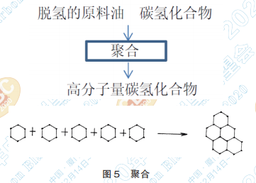 圖5在步驟4中,從步驟3中脫氫后的芳香化 合物發(fā)生聚合反應(yīng)。聚合反應(yīng)是“將兩個(gè)或多個(gè) 分子合成一個(gè),其總分子量為跟分子之和,而其物 理性質(zhì)不同”。在這一步當(dāng)中,脫氫后的芳香族化 合物迅速反應(yīng)生成了非常復(fù)雜的高分子量芳香化 合物。這些聚合反應(yīng)在氣態(tài)下發(fā)生,生成了非常 高沸點(diǎn)的化合物。