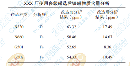 ■ 輔助去除:在炭黑生產(chǎn)流程中引入多級(jí)磁 選設(shè)備,對(duì)炭黑中的鐵磁物質(zhì)進(jìn)行磁選分離,以達(dá) 到去除鐵磁性物質(zhì)的目的。