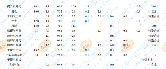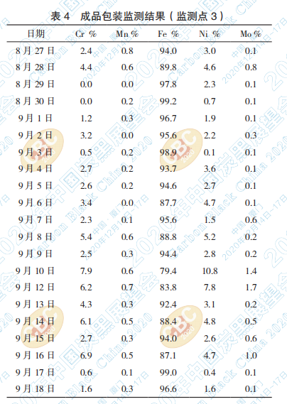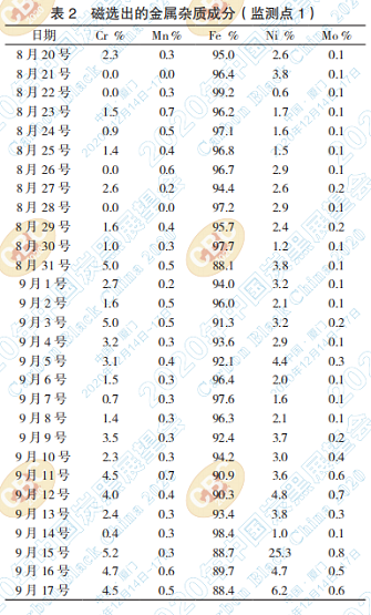 根據(jù)監(jiān)測(cè) 1 的成分分析結(jié)果,整體磁選出來 的雜質(zhì)更接近設(shè)備成分中的鑄造合金成分,設(shè)備 來源自風(fēng)機(jī)葉輪、氣密閥、主袋袋濾花板等。部 分成分摻雜了 304、310、321 等材料(比較少, 難以分辨)。