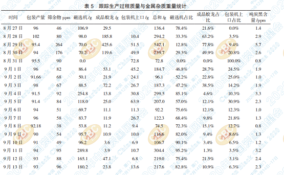 根據(jù)表5中的統(tǒng)計(jì)結(jié)果發(fā)現(xiàn),磁選機(jī)在連續(xù)作 業(yè)的情況下,仍為清理金屬雜質(zhì)的重要設(shè)備,而個(gè) 別情況下磁棒也發(fā)揮了關(guān)鍵的作用。分析認(rèn)為, 磁選機(jī)工作的溫度較高,在150-200攝氏度,連續(xù) 作業(yè)會(huì)出現(xiàn)消磁。
