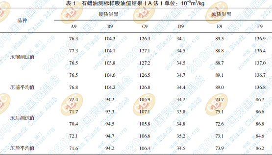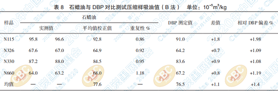 石蠟油儀器法(A法)測試SRB9#炭黑的結(jié)果 見表 1。