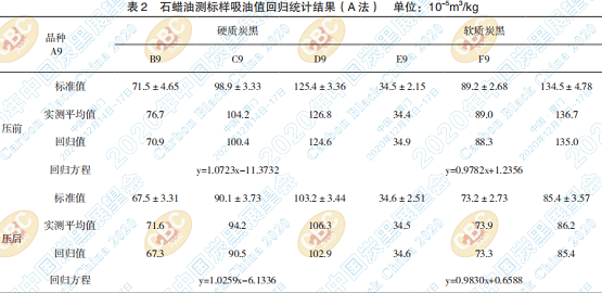 以A9~F9標(biāo)準(zhǔn)值與測試平均值分別建立硬質(zhì)、 軟質(zhì)炭黑壓前和壓縮樣回歸曲線,見圖1~圖4,用 回歸方程對測定值進行回歸計算回歸值,結(jié)果見 表 2。