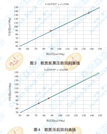 4.1 由于石蠟油的密度比 DBP 密度小,炭黑進行吸 收油時過程也會有一定差異,結(jié)果表現(xiàn)出石蠟油 的實測值比 DBP 大,通過標(biāo)樣進行回歸校正后能 具有一致性。