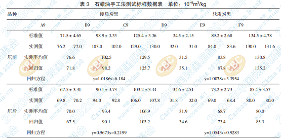 按 GB/T 3780.2 - 2017《炭黑第 2 部分:炭黑 部分:壓縮試樣吸油值的測定》的規(guī)定,用石蠟油 對ASTM D24標(biāo)準(zhǔn)參比炭黑SRB9系列(A9~F9)進 行手工法平行測試,建立回歸曲線方程。