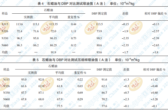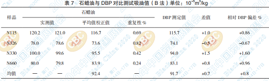 用石蠟油進行儀器法測試N115、N326、N330、 N660樣品吸油值(OAN)和壓縮樣吸油值(COAN), 同時用 DBP 對比測試,結(jié)果見表 4、表 5,通過重 復(fù)性分析和與 DBP 吸油值對比分析,重復(fù)性優(yōu)于 標(biāo)準(zhǔn)中規(guī)定的重復(fù)性,同時也發(fā)現(xiàn) DBP 吸油值均 大于石蠟油吸油值,相對平均偏差為 1.8%,表明不同油種測試的吸油值還是存一定的系統(tǒng)誤差, 但仍在標(biāo)準(zhǔn)規(guī)定的再現(xiàn)性范圍內(nèi)。