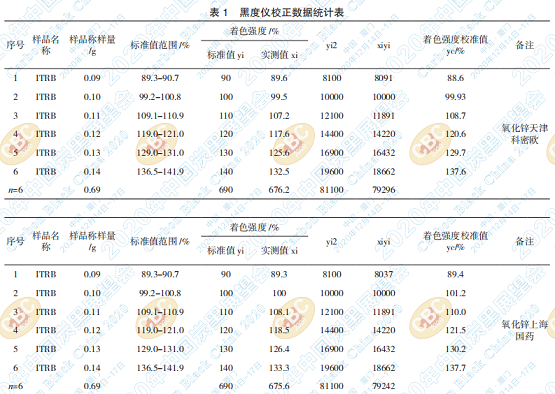 我們用的兩臺(tái) B 型黑度儀,從長(zhǎng)期的使用來(lái) 看,一直較為穩(wěn)定。我們分別用上海國(guó)藥和天津 科密歐的氧化鋅對(duì)參比炭黑作黑度校正,黑度儀 校正數(shù)據(jù)統(tǒng)計(jì)見(jiàn)下表 1。