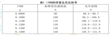 不同著色參比炭黑(ITRB)稱樣量(從0.0900g 到 0.1400g)進(jìn)行對(duì)比實(shí)驗(yàn),數(shù)據(jù)見(jiàn)下表。