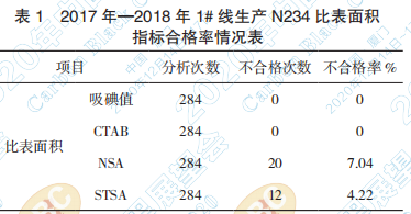 通過統(tǒng)計可以看出,2017 年—2018 年我公司 1#線生產的N234產品表征比表面積的四項指標, 吸碘值指標合格率100%,CTAB指標合格率100%, NSA指標合格率92.96%(不合格率7.04%),STSA 指標合格率 95.78%(不合格率 4.22%),在吸碘 值、CTAB 合格的情況下,NSA、STSA 指標均出現(xiàn) 不合格情況,致使全年的產品合格率受到影響。
