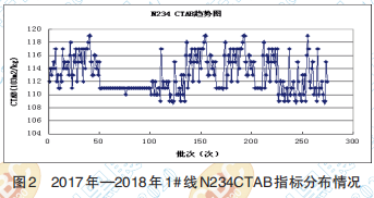 從上圖可以看出 N234 CTAB 指標波動大,雖 然指標均合格但大多數數值接近下限值。