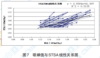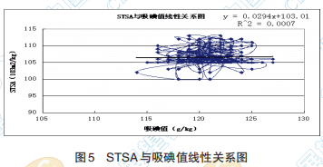 通過對2017-2018年1#線N234 STSA與吸碘值 指標的統(tǒng)計,應用線性回歸的方法查找兩者之間 的關聯(lián)性,其回歸關系如下圖 5: