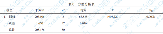 擬合優(yōu)度用于檢驗樣本回歸直線對觀測值的 擬合度,在一元線性回歸方程中,用判定系數 R2 衡量估計方程對樣本對觀測值的擬合程度,在多 元線性回歸方程中,同樣也可以,R2 的值越接近 1,表明回歸方程對實際觀測值的擬合度效果越 好。模型整體擬合效果見表 7: