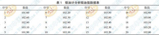 取 4 號(hào)標(biāo)樣(吸油值范圍:101.4 ~ 103.8,中 值為 102.6)混勻后分成二十份,在同一作業(yè)環(huán)境 (同一個(gè)實(shí)驗(yàn)室,同樣的溫度、濕度),分析數(shù)據(jù) 如下表(表 1):