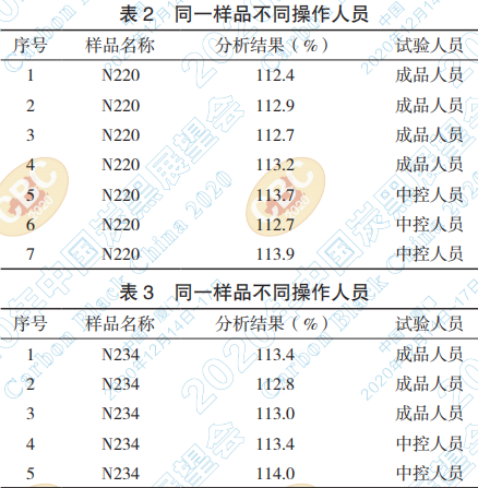 可安排不同的操作人員在同一臺(tái)儀器設(shè)備上 對(duì)同一個(gè)樣做對(duì)比實(shí)驗(yàn),舉N220和N234進(jìn)行對(duì)比 實(shí)驗(yàn)的例子如下表(表 2、表 3):