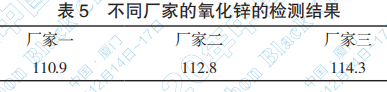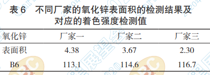 使用同一批 N220 樣品,分別用不同廠家的氧 化鋅做的著色強(qiáng)度檢測(cè)值見(jiàn)下表(表 5)。