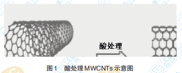 酸處理MWCNTs的示意圖如圖1所示,在混酸 強(qiáng)氧化劑作用于 MWCNTs 的純化時(shí),可以首先使 得雜質(zhì)被氧化,亦能造成 MWCNTs 產(chǎn)生破損或斷 裂,一方面使得碳納米管細(xì)化,另一方面造成了碳 管表面官能團(tuán)(-OH、C=O 等)生成。