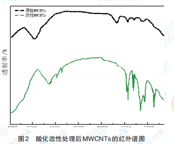 酸化改性處理后MWCNTs的紅外譜圖見圖2。 由圖 2 中可以看出經(jīng)混酸處理后的試樣在 3000~ 3500cm-1區(qū)域出現(xiàn)了典型的由分子內(nèi)締合 -OH 引 起的伸縮振動峰,說明在強(qiáng)氧化劑作用下使得 MWCNTs表面帶上了一定數(shù)量的羥基。在1620cm-1 附近出現(xiàn)了極微弱的吸收峰是由羧基中 C=O 伸縮 振動引起的,而在 1420cm-1和 1260cm-1附近處分 別出現(xiàn)了較強(qiáng)的 -COO- 對稱伸縮振動峰和較強(qiáng)的 酚類 C-O 伸縮振動峰,說明混酸處理能在碳管表 面形成一定量的羧基和羥基,可以增加其與極性 分子的相容性,為其能夠穩(wěn)定地分散在橡膠中提 供了前提條件。
