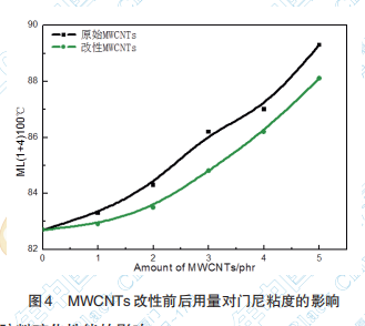MWCNTs 改性前后用量對門尼粘度的影響見 圖4。從圖4中可以看出在胎面膠體系中用一定量的碳管替代炭黑后隨著碳納米管用量的增加,膠 料的門尼粘度逐漸增大,原始碳納米管的增長趨 勢比較明顯,說明碳納米管的長徑比越大對橡膠 分子鏈?zhǔn)`作用越大,致使膠料粘度增大,加工性 能變差。經(jīng)短切改性的碳納米管其長度減小,大 范圍纏繞束縛作用減弱,有利于機(jī)械共混,提高了 其在橡膠基體中的分散,門尼粘度隨著改性碳管 含量的增加上升趨勢相對緩慢。