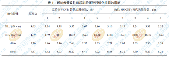 碳納米管改性前后對胎面膠料硫化性能的影 響見表 1。