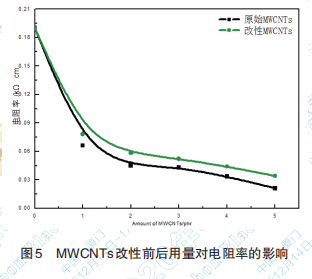 基于碳納米管的基本結(jié)構(gòu),碳納米管具有良 好的導(dǎo)電和導(dǎo)熱性能, MWCNTs 改性前后用量對電阻率的影響見圖 5。從圖5中可以看出用碳納米管替代1phr炭黑后, 硫化膠表面電阻率直線下降,且隨著碳納米管用 量的增大,電阻率均有明顯的下降,說明添加碳納 米管對膠料的導(dǎo)電性能有大幅提高。相比原始 MWCNTs 電阻率,相同用量下改性 MWCNTs 電阻 率下降幅度較低;