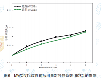 MWCNTs改性前后用量對導(dǎo)熱系數(shù)(60℃)的 影響見圖6。從圖6中可以看出隨著碳納米管用量 的 增 大,膠 料 的 導(dǎo) 熱 系 數(shù) 均 有 所 提 高,改 性 MWCNTs 熱導(dǎo)率上升幅度相對較低,分析原因是 由于碳管經(jīng)酸化短切后,碳管表面缺陷增多,碳管 的長徑比減小,雖然能提高其與有機(jī)相的親和力, 能夠較好的在橡膠基體中分散,但碳管表面過多 的缺陷端口,會增加其界面熱阻[6]。