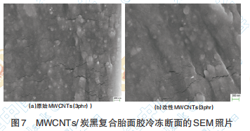 圖7分別為原始MWCNTs與改性原始MWCNTs 替代 3phr 炭黑用量時(shí)胎面膠的斷面掃描圖,原始 MWCNTs 在橡膠表面的斷面端頭較多且分布不均 勻,被抽出到表面的碳管長度較長;改性MWCNTs 斷面端頭減小,比較均勻的分散在橡膠中,但是也 有少量碳管被抽出到表面,露出脆斷面的碳管長 度較短。