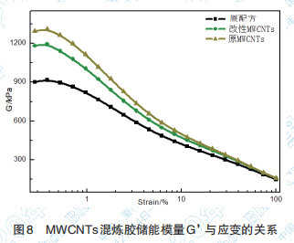 從圖8中可知,加入碳納米管后,混煉膠的儲 能模量明顯提高,原始 MWCNTs 管越長,初始模 量越高,分析由于碳管長度大易相互纏繞形成互 鎖網(wǎng)絡(luò)結(jié)構(gòu),隨著應(yīng)變的增大,穿插的網(wǎng)絡(luò)結(jié)構(gòu)被 拉緊破壞易聚集成較大團(tuán)聚體,模量下降較快。改 性 MWCNTs 碳管表面缺陷增多,與橡膠的結(jié)合能 力增強(qiáng),短切后長徑比減小,纏繞束縛力減弱,碳 管間平均距離增大,小應(yīng)變下不易聚集,初始模量 降低。