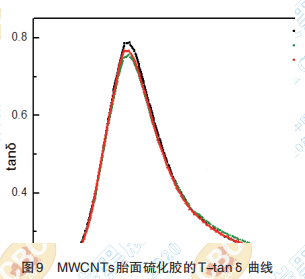 60℃ tanδ值常被用來表征胎面膠滾動阻力的 大小,60℃時(shí) tanδ 值大則滾動阻力大,反之,滾 動阻力小。MWCNTs胎面硫化膠的T-tanδ曲線見 圖 9。