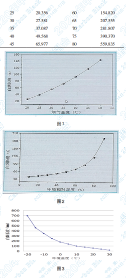 濕法脫硫的排出口煙氣處于濕飽和狀態(tài),溫度 越高含濕量越大(表1),在空氣中擴(kuò)散越困難,形 成的白色煙羽拖尾越長(圖1),煙囪周圍空氣相對(duì) 濕度越大濕煙羽中水分難以及時(shí)散開(圖2),環(huán)境 溫度越低,白色煙羽長度呈指數(shù)關(guān)系增加(圖3)。