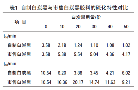 自制白炭黑與市售白炭黑膠料的硫化特性(145℃)對(duì)比如表1所示。從表1可以看出,自制白炭黑膠料與市售白炭黑膠料的t10和t90相差較大。這是由于無(wú)機(jī)填料的酸堿性對(duì)膠料的硫化特性影響較大,呈酸性的填料阻礙硫化,導(dǎo)致硫化時(shí)間延長(zhǎng);呈堿性的填料促進(jìn)硫化,導(dǎo)致硫化時(shí)間縮短,本研究自制白炭黑呈堿性,而市售白炭黑呈酸性,因此自制白炭黑膠料與市售白炭黑膠料的硫化特性差異較大。