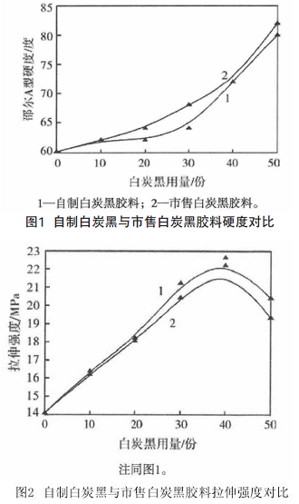 自制白炭黑與市售白炭黑的耐屈撓龜裂性能試驗(yàn)結(jié)果為:自制白炭黑和市售白炭黑用量為0~50份時(shí),膠料屈撓6萬(wàn)次未出現(xiàn)屈撓龜裂現(xiàn)象。這說明自制白炭黑和市售白炭黑在偶聯(lián)劑的作用下與橡注同圖1。
