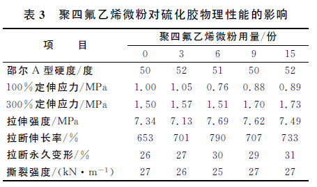 聚四氟乙烯微粉對(duì)硫化膠物理性能的影響如表3所示。