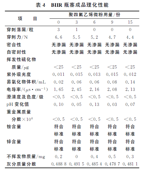 從表4可以看出,添加聚四氟乙烯后,BIIR瓶塞的化學(xué)性能未發(fā)生明顯變化,說(shuō)明聚四氟乙烯化學(xué)性能穩(wěn)定。此外,加入聚四氟乙烯微粉的BIIR瓶塞的穿刺力明顯小于未加聚四氟乙烯的產(chǎn)品,且隨著聚四氟乙烯微粉用量的增大,BIIR瓶塞穿刺力明顯減小,同時(shí)穿刺落屑現(xiàn)象也得到明顯改善。