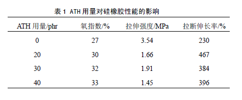 ⑴ 硅橡膠中添加30 份ATH 后,材料氧指數(shù)達(dá)到32%,拉伸性能及阻燃性能相對(duì)較好。