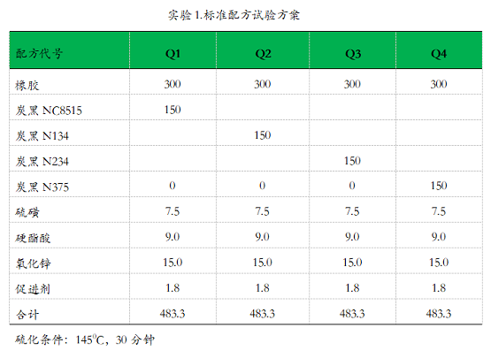 實驗1以橡膠標準配方作為依據(jù),通過對比NC8515、N134、N234、N375炭黑及其混煉膠的拉伸強度、拉斷伸長率、100%定伸應(yīng)力、300%定伸應(yīng)力和DIN磨耗數(shù)據(jù),分析對比NC8515炭黑與N134、N234及N375炭黑對橡膠性能的影響,來評價NC8515炭黑的優(yōu)缺點;實驗2采用半鋼子午線輪胎工業(yè)配方,在實驗室進行小配合實驗,研究NC8515炭黑應(yīng)用于胎面膠配方中性能。