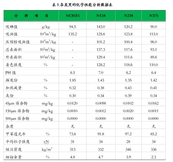 按照炭黑的分析方法對表征炭黑性能的幾個指標進行了分析,分析結(jié)果如表1.