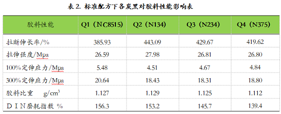 研究輪胎標準配方中各炭黑對膠料性能的影響,我們分析了膠料的拉伸強度、扯斷伸長率、100%定伸應(yīng)力、300%定伸應(yīng)力、膠料比重、DIN磨耗指數(shù),其分析結(jié)果如表2.