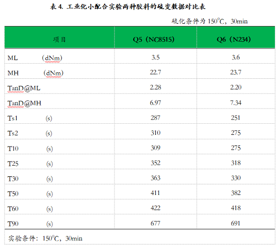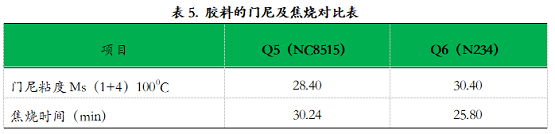 由上表可以看出:用N234炭黑填充的膠料門尼粘度比用NC8515炭黑填充的膠料高2度,焦燒時間是用NC8515炭黑填充的膠料更長,加工安全性更佳。