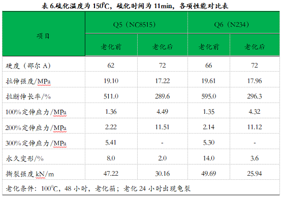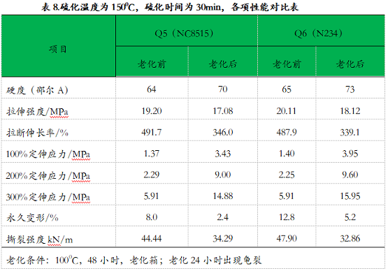 由上表可以看出:對應(yīng)于NC8515炭黑填充的硫化膠和N234炭黑填充的硫化膠,膠料的硬度N234炭黑填充的硫化膠老化前高4度,老化后相當,老化前后兩種炭黑填充的硫化膠拉伸強度和定伸應(yīng)力無明顯變化撕裂強度也未見明顯變化,但用NC8515填充的硫化膠的永久變形老化前后均優(yōu)于用N234炭黑填充的硫化膠。