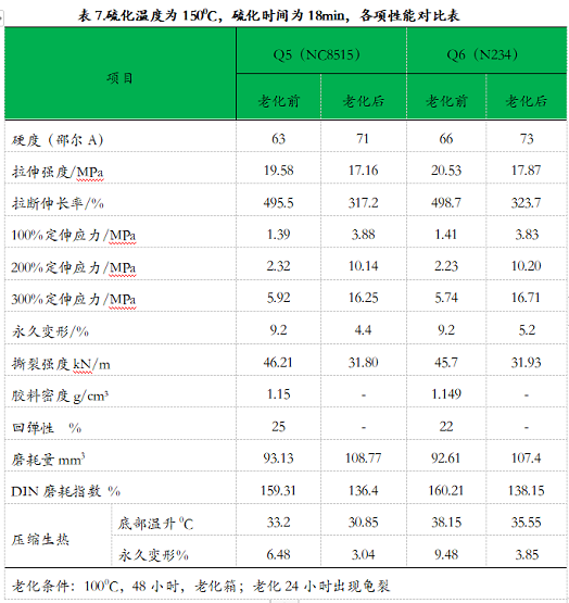 小結(jié):由上表可以看出,在硫化溫度為150℃,硫化時間為18min時分析兩種炭黑填充的硫化膠老化前后性能,膠料的硬度N234炭黑填充的硫化膠比NC8515炭黑填充的硫化膠均高2-3;老化前后的拉伸強度、伸長率及100%定伸應(yīng)力、200%定伸應(yīng)力和300%定伸應(yīng)力均無明顯變化;撕裂強度表現(xiàn)一致,永久變形及磨耗量、DIN磨耗指數(shù)相當,表明兩種炭黑的耐磨性相當,壓縮生熱方面,用NC8515炭黑填充的硫化膠壓縮溫升老化前后均比N234炭黑填充的硫化膠低50C,表明此種炭黑的耐磨性優(yōu)異,生熱降低。