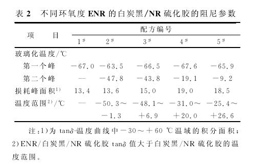 減震材料要求具有高tanδ,理想的阻尼材料要求材料在整個工作溫度范圍內(nèi)都有較大的內(nèi)耗,也就是要求材料在工作溫度范圍內(nèi)tanδ-溫度曲線變化平緩,與溫度坐標(biāo)之間的包圍面積盡量大。從表2還可以看出,在工作溫度范圍-30~+60℃內(nèi),ENR的加入提高了白炭黑/NR硫化膠的積分面積,并且隨著加入ENR環(huán)氧度的升高,峰面積先增大后減小,加入ENR-40時達(dá)到最大,比白炭黑/NR硫化膠提高了42.6%,而加入ENR-50的白炭黑/NR 硫化膠比ENR-40稍有降低。